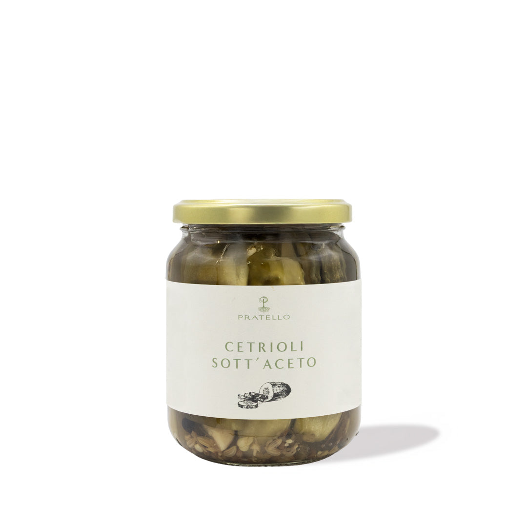 Knackig und aromatisch, hergestellt aus Gurken aus unserem Garten, Essig, Salz und einer Gewürzmischung. Perfekt, um Vorspeisen, Sandwiches und Salaten eine lebendige Note zu verleihen.