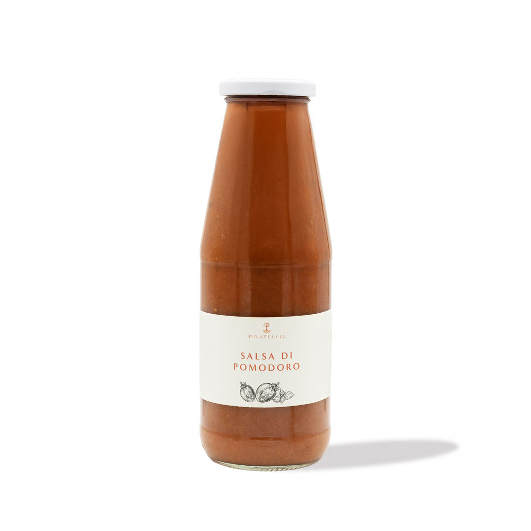 Unsere reifen Tomaten, mit einem Hauch Karotte, Zwiebel, Öl und Basilikum: eine traditionelle, einfache und natürliche Sauce, bereit zum Erwärmen und Servieren.